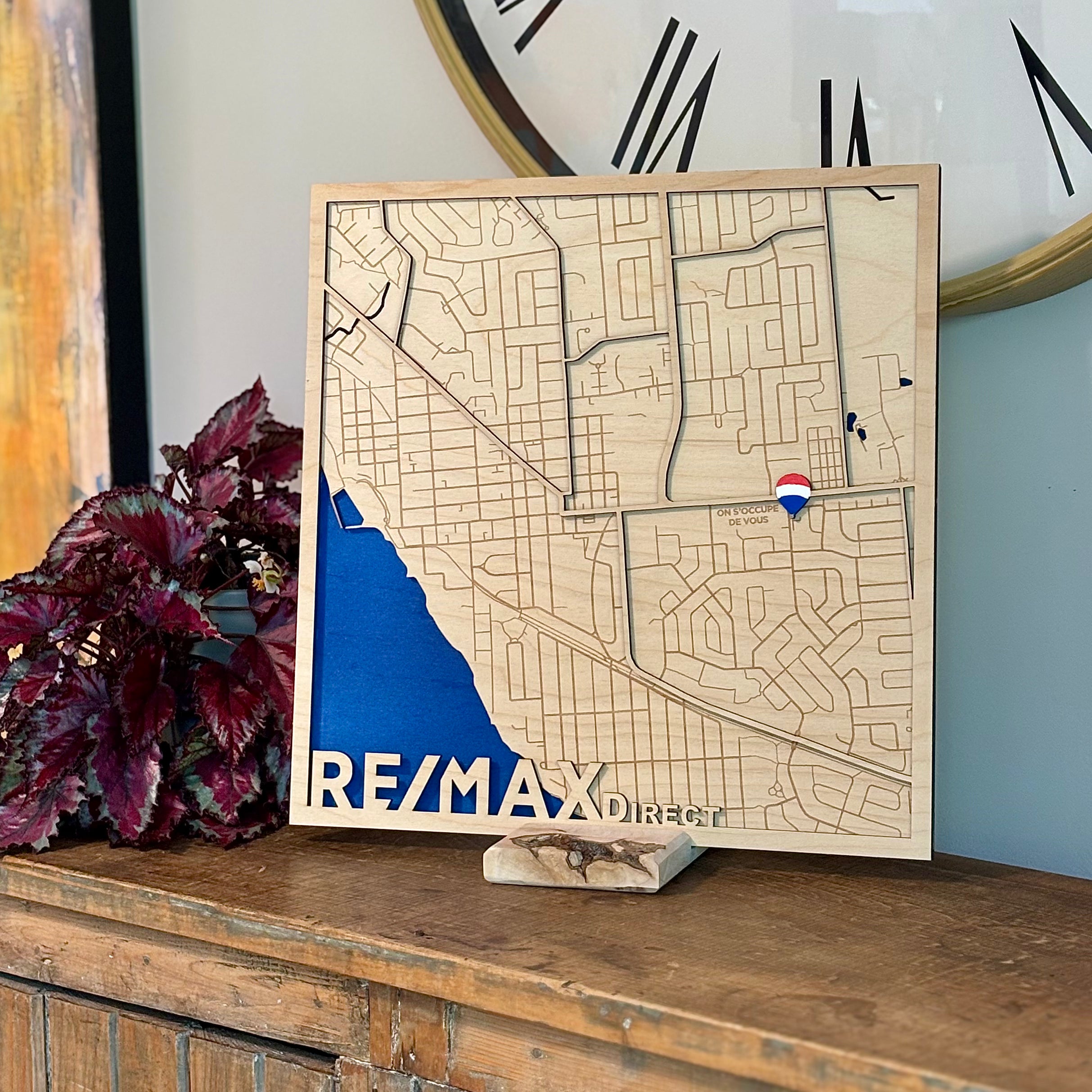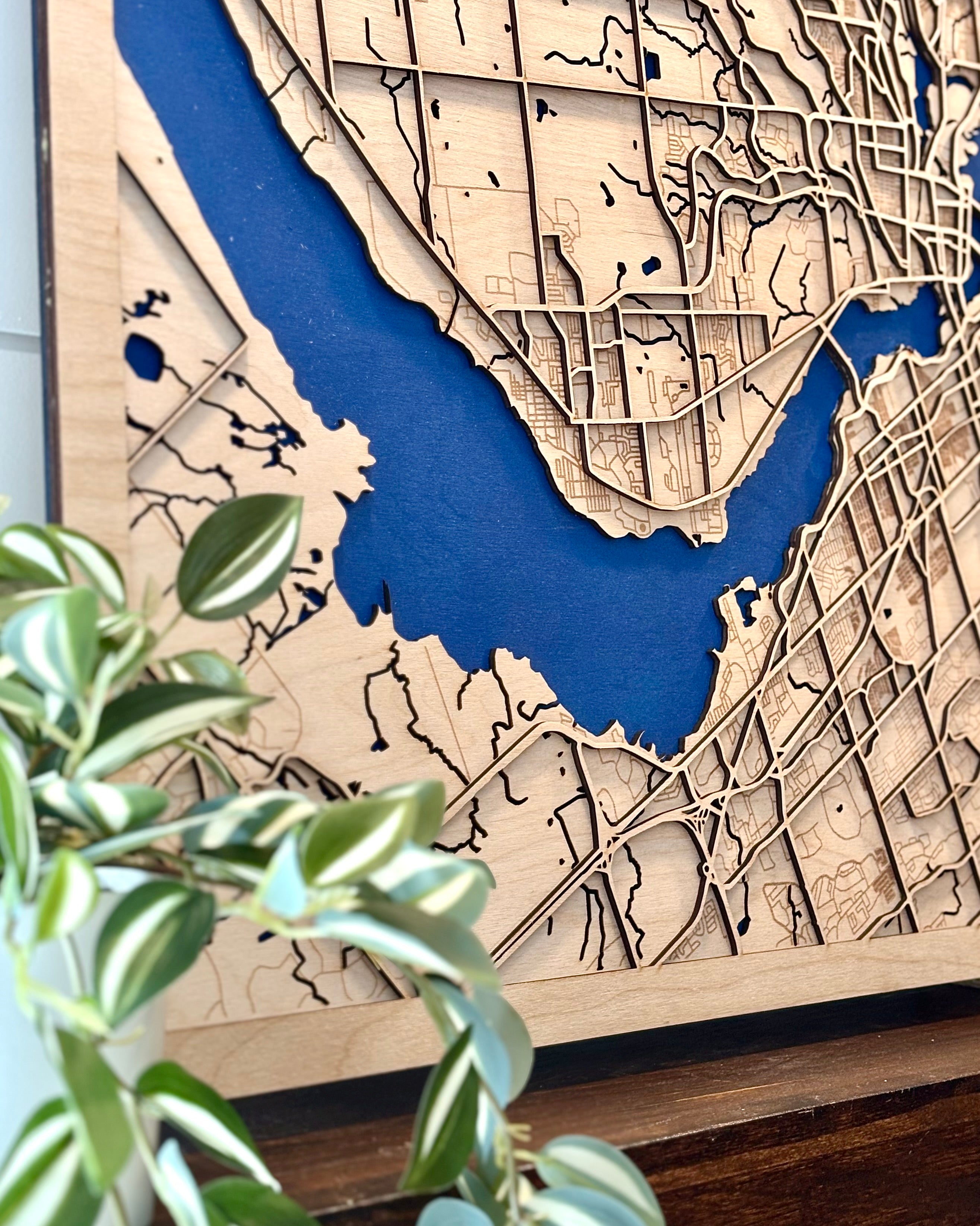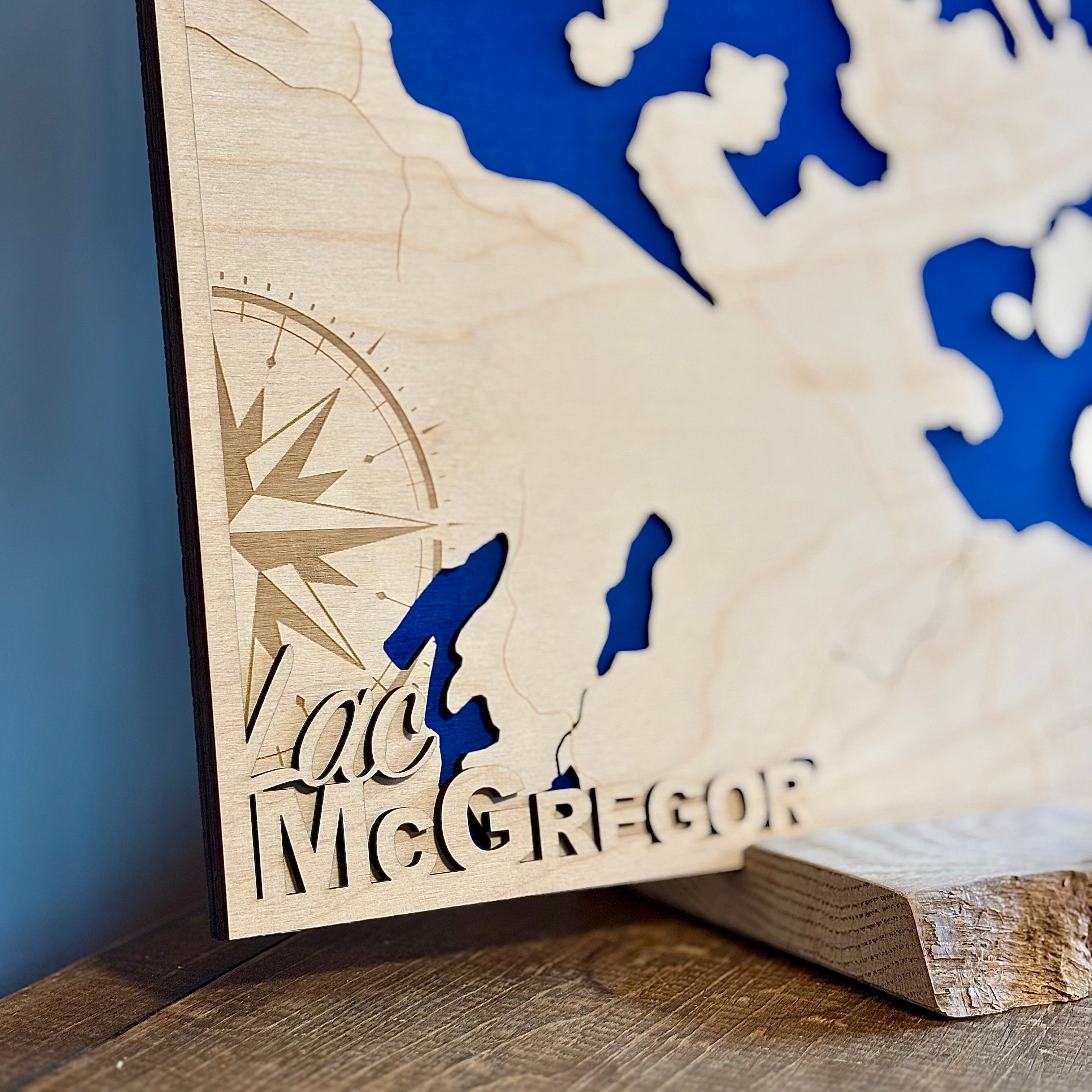 la gravure au laser. Nous créons des cartes personnalisées de villes, lacs, îles et lieux marquants. Nous offrons aussi des jeux de crib, des cadeaux d’entreprise, des médailles & trophées et plus encore. Chaque pièce est conçue avec soin dans notre atelier,